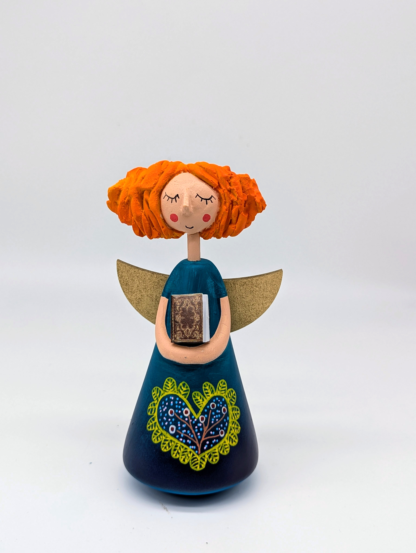 • Figurinha decorativa de anjo com cabelo laranja e vestido azul