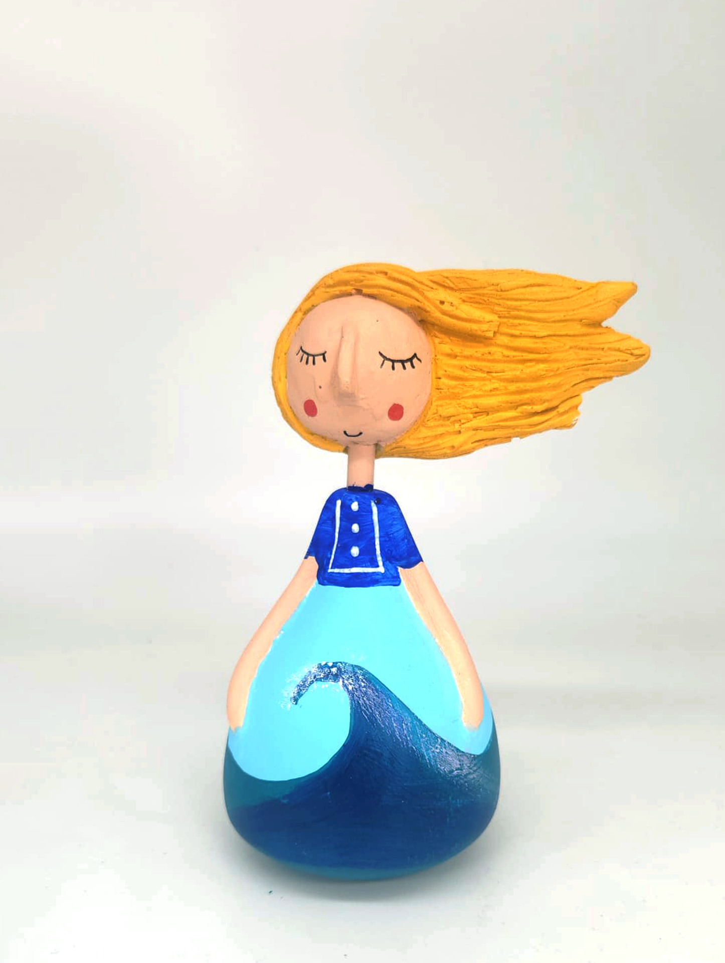 • Figura decorativa de menina com cabelo amarelo e vestido azul com padrão de onda